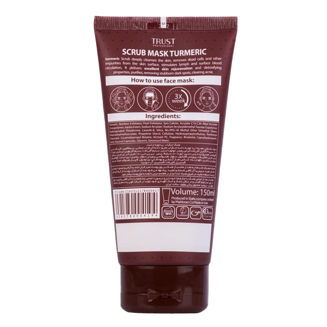 | نحوه مصرف | شبها به مقدار مناسب از ماسک، روی پوست تمیز قرار داده، به آرامی و بصورت دورانی ماساژ دهید. سپس با آب کافی شستشو نمایید. پیشنهاد میشود بعد از اسکراب پوست، از کرم آبرسان تراست استفاده نمایید. |
