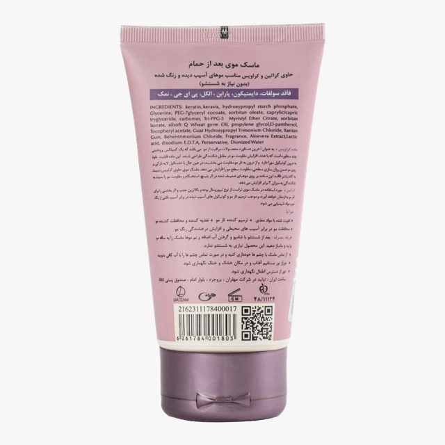 | نحوه مصرف | بعد از شستشو با شامپو و گرفتن آب اضافه و نم موها ماسک را به ساقه مو بزنید و ماساژ دهید. این محصول نیازی به شستشو ندارد |