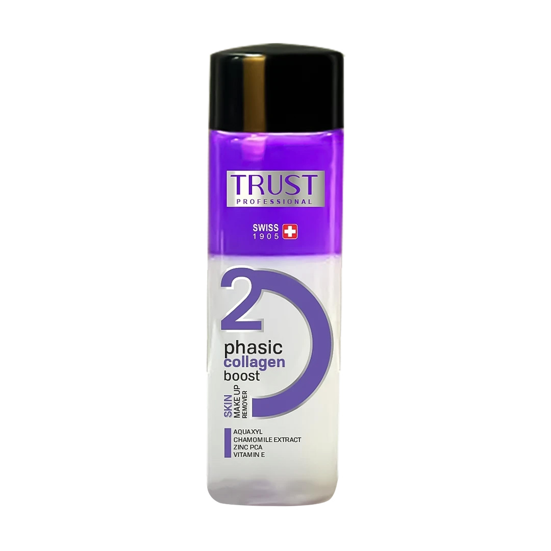 محلول پاککننده آرایش دوفازی تراست، تمام آلودگیها و مواد آرایشی معمولی و ضدآب را از پوستمان پاک کرده و اثری از آنها به جای نمیگذارد. این محصول با وجود ماده مؤثره پروتئین هیدرولیز شده کلاژن از پیری پوست جلوگیری کرده، باعث استحکام پوست و جلوگیری از باز شدن منافذ پوست می شود. محلول دوفازی ضمن پاککنندگی پوست به خاطر داشتن ماده مؤثره آکواکسیل در ساختار خود، پوست را آبرسانی کرده و مانع از تبخیر آب پوستی میشود. همچنین با داشتن عصاره بابونه و ویتامین ای در ترکیباتش از التهابات پوستی جلوگیری کرده، آن را نرم و باطراوت میکند و مانع از آسیب رادیکالهای آزاد به پوست میشود. زینک پی سی ای در فرمولاسیون محصول ترشح سبوم را کنترل کرده، منافذ پوستی را جمع کرده و از ایجاد جوش و آکنه روی پوست جلوگیری میکند. در ضمن عصاره روغن بادام در این محلول دوفازی تراست به آبرسانی، تقویت پوست و پاکسازی کامل مواد آرایشی از روی پوست کمک شایانی میکند.