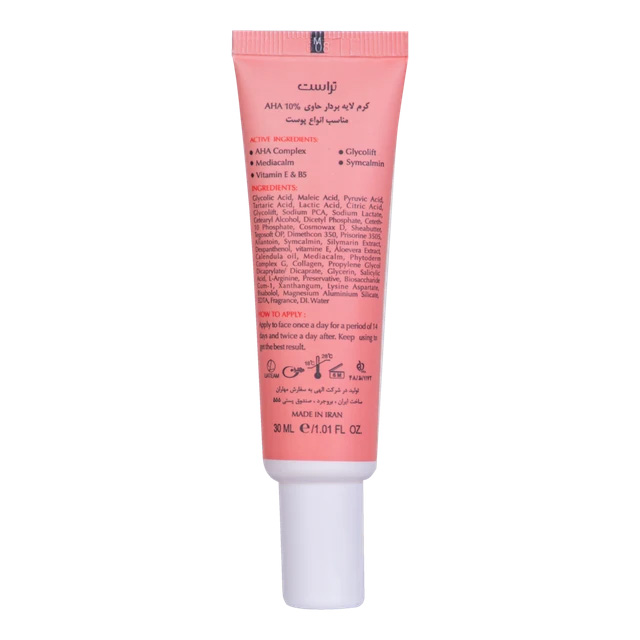 کرم لایهبردار تراست حاوی 10 درصد آلفا هیدروکسی با لایهبرداری سلولهای پیر و فرسوده، قدرت بازسازی پوست را به آن بازمیگرداند تا علاوه بر کم شدن میزان چینوچروکهای سطحی، پوستی یکدست، شفاف، جوان و روشن پیدا کنید.
