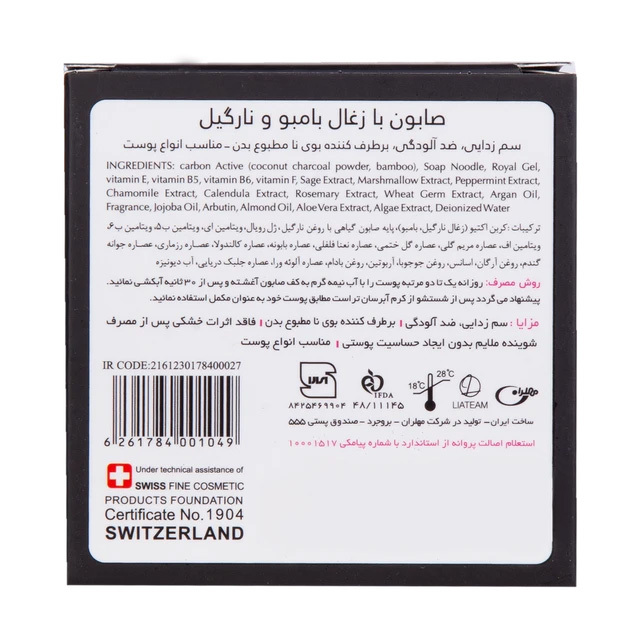| نحوه مصرف | صابون را روی پوست مرطوب مالیده تا کف غلیظ تولید شده و پس از یک دقیقه با آب ولرم شسته شود |