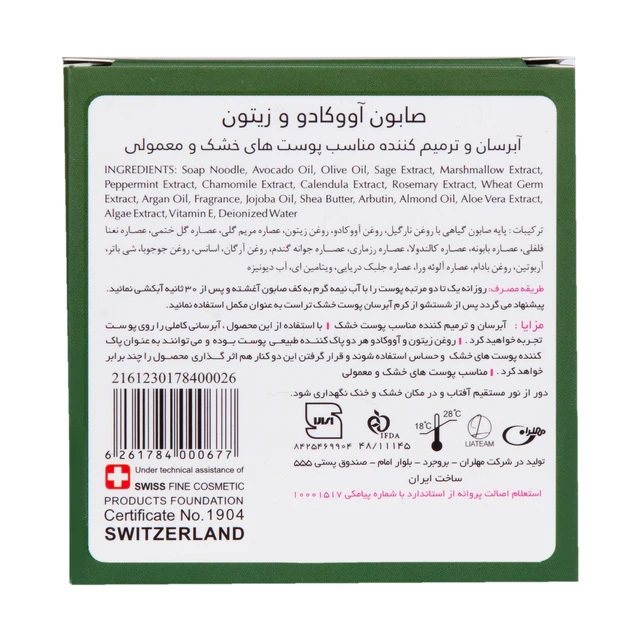 | نحوه مصرف | صابون را بر روی پوست مرطوب مالیده تا کف غلیظ تولید گردد، پس از یک دقیقه با آب ولرم شسته شود |