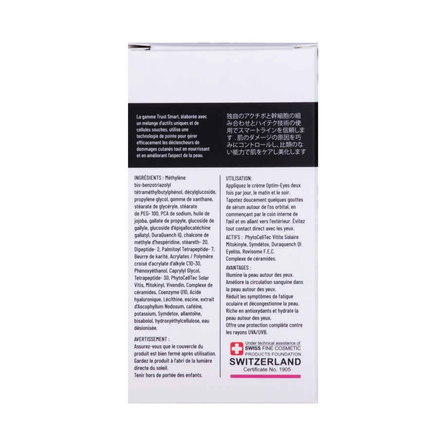 این ترکیب کمپلکسی کپسوله شده از ترکیبات فعال عصاره جلبک، کافئین و عصاره گیاهی است که به عنوان ترکیب فعال اختصاصی در جهت رفع تیرگی و حلقههای تیره دور چشم در فرمولاسیون کرم دور چشم ضد چروک و تیرگی اسمارت تراست مورد استفاده قرار گرفت. تکنولوژی مورد استفاده در انتقال این ترکیبات فعال به نحوی طراحی شده است که ترکیبات فعال به لایههای عمقیتر پوست نفوذ کرده و بیشترین تاثیر را در این ناحیه ایجاد میکنند. این ترکیبات با توانایی بالایی که برای گشاد کردن عروق خونی زیر چشم دارند، التهابات پوست در این ناحیه را تسکین میبخشند، و به رفع تیرگی دور چشم کمک میکنند.