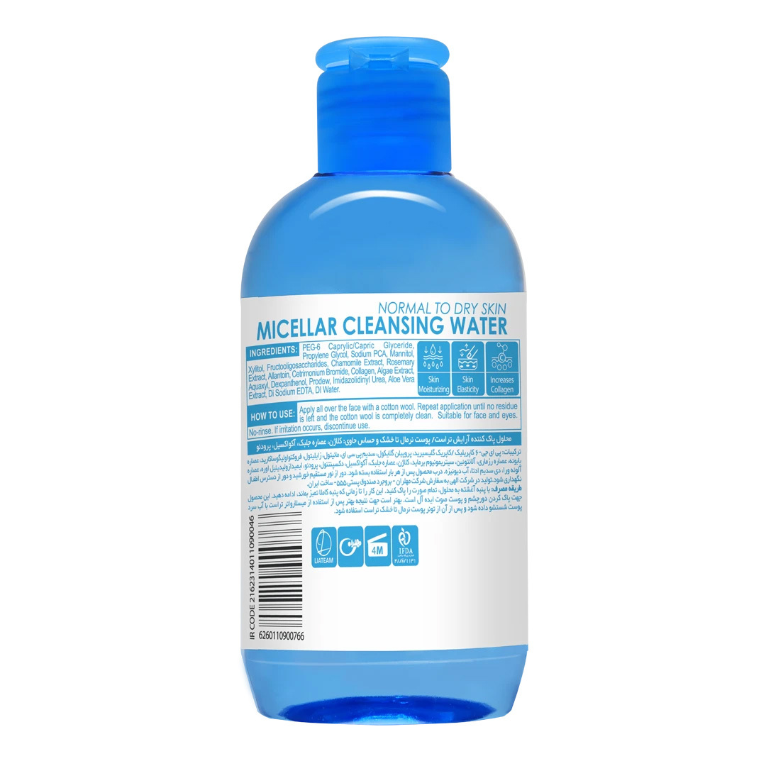 | کاربرد | پاک کردن آرایش (حتی آرایشهای ضدآب) بدون ایجاد تغییر در لایههای محافظ پوست، تمیز کردن انواع آلودگیها و ناخالصیها از روی پوست، التیام بخشیدن به پوستهای خشک و نرمال، افزایش بخشیدن به رطوبت پوست، حفظ pH فیزیولوژیک پوست |