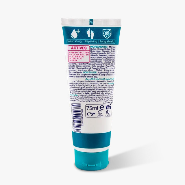 | کاربرد | ترمیمکننده ترکهای پا، آبرسان و بهبوددهنده خشکی پوست پا، نرمکننده عالی و مغذی پوست، ضد التهاب و جلوگیری از عفونتهای قارچی، لایهبرداری ملایم و حذف سلولهای مرده پوست |